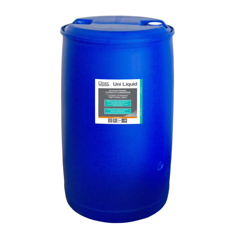 Clinex LAUNDRY-LINE Uni Liquid to profesjonalny, wysokoskoncentrowany płyn piorący dla pralnic profesjonalnych. Dostosowany do wszystkich rodzajów pralnic i tkanin zarówno białych jak i kolorowych. Zawiera substancje usuwające zabrudzenia techniczne i gastronomiczne.